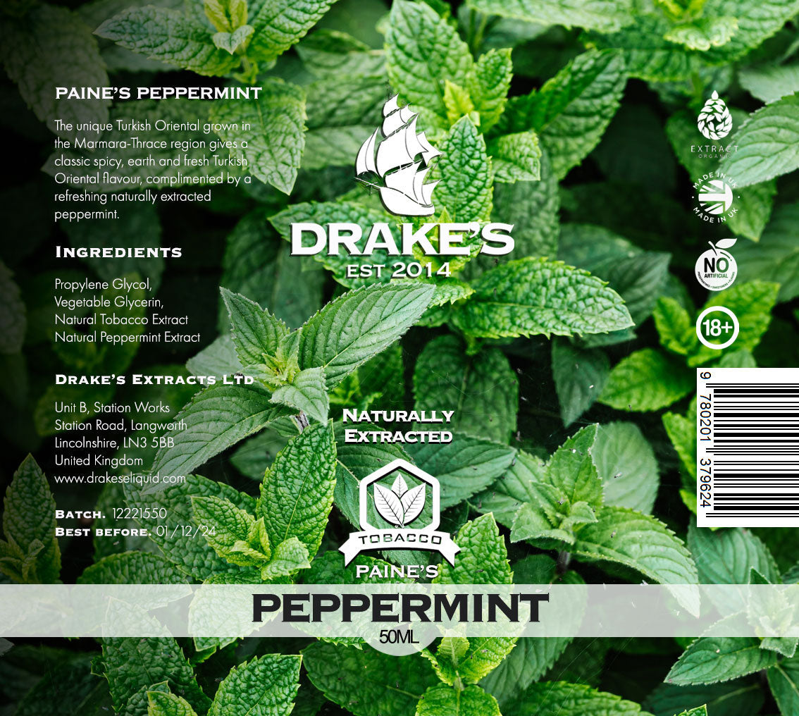 Paine’s Peppermint Tobacco 50ml E-liquid by Drake's brings together the boldness of tobacco and the refreshing taste of mint for a truly unique vaping experience. Handmade in the UK, this premium e-liquid combines authentic Oriental tobacco and British peppermint extract to deliver a rich and satisfying flavour profile.